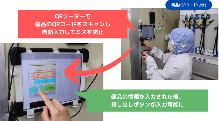 備品にはQRコードがついており、タブレット横に設置されているリーダーでQRコードをスキャンすることにより、貸し出し記録帳票にも借りた備品の情報を自動入力することで記入ミスを防ぐなど、現場で入力する人が使いやすくなる工夫がここにも盛り込まれている。