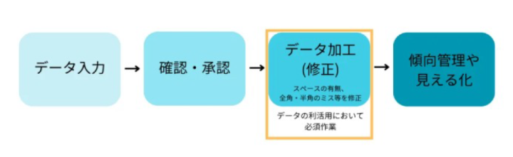元あったExcelデータには、誤入力が多数発生していた。例えば、スペースの有無、全角・半角のミス、などが多数発生しており、見える化には、表記を統一させるためにデータ加工(修正)が必要だった。