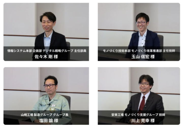 今回は、情報システム本部 企画部 デジタル戦略グループ 佐々木様、モノづくり技術本部 モノづくり改革推進部 玉山様、パワーエレクトロニクス事業部 山崎工場 製造グループ 塩田様、井上様、特殊鋼事業部 安来工場 モノづくり支援グループ 川上様にお話を伺った。