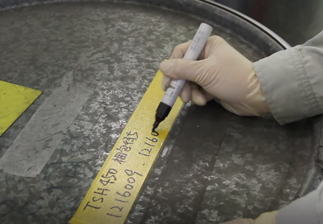 手書きで行っていた業務は、運転記録などの帳票類だけではない。購入した原料や工程毎の仕掛品を識別管理する為に、作業者がガムテープと油性ペンを使って原料や仕掛品に対し手書きで識別情報の記入を行っていた。