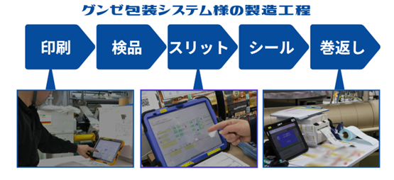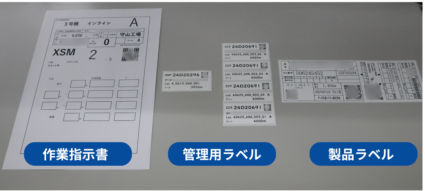 グンゼ包装システム株式会社 守山工場では、包装ラベルの印刷・検品・スリット・シール・巻返しといった複数工程を持ち、包装材料の加工を行っている。シーズン性があるものも多く多品種小ロット生産となっており、管理用の製品ラベルを複数枚発行して運用していた。