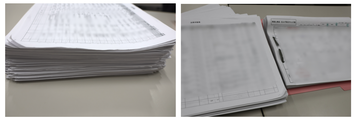 従来、各工程では生産日報や立上げチェック表、品質記録を全て手書きで管理していた。最終工程では、作業者は1ロットごとに記録を行い、1枚あたり約5分を要していた。かなりの時間が記録業務に費やされており、15名規模の現場では間接工数として目立つものだった。さらに、出荷時にはロット番号を手書きで転記し、成績書を作成したり、過去データの確認が必要な場合は、保管ファイルを遡って紙の記録を探し出す必要があったりするなど、手書き帳票と転記作業が、生産効率向上を阻害する要因となっていた。さらに、取引先からの問い合わせでチェック項目が増え続けるなど、生産活動そのものに使える時間が圧迫されていったことも、大きな課題であった。
