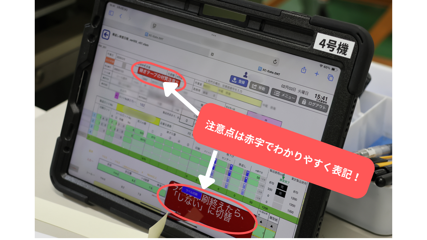 最初は巻返し工程のみで「XC-Gate」での利用を行ったが、全工程への展開は徐々に展開するスモールスタートではなく、「やると決めたら一気にやる」導入姿勢であった。3ヶ月間、段階的に現場テストを行いながら、最終的には全ラインほぼ同時に電子化へ切り替えた。導入当初は「iPadを使いこなせるだろうか」という不安の声もあったが、実際にはスマートフォンに慣れている作業者が多く、短期間で順応。現在では「もう紙には戻れない」という声が上がるほど、業務負荷の軽減を実感している。
